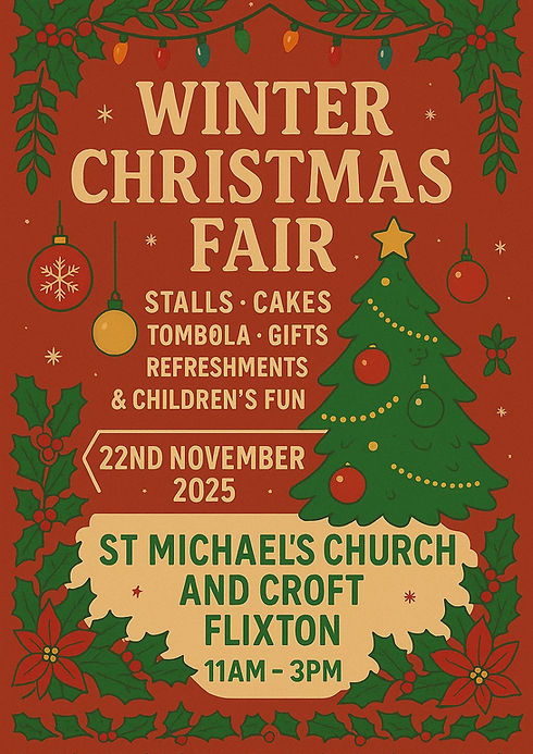 Get into the Christmas spirit at our Winter Fair at St Michael’s Church and Croft, Flixton on Saturday 22nd November 2025, from 11 a.m. to 3 p.m.!